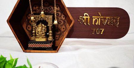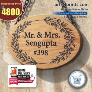Add a sophisticated touch to your entrance with this oval wooden name plate featuring Mr & Mrs Sengupta design with floral engraving.