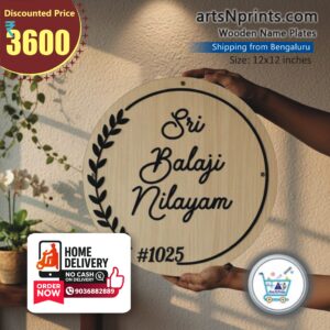 Give your home a divine identity with this Sri Balaji Nilayam wooden name plate, crafted in a modern round design.